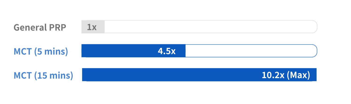 With MCT, you can expect regenerative capabilities more than 3 times stronger than general PRP or stem cell treatments. Augmented quantities of exosomes and growth factors significantly boost tissue regeneration in procedures where MCT is applied.