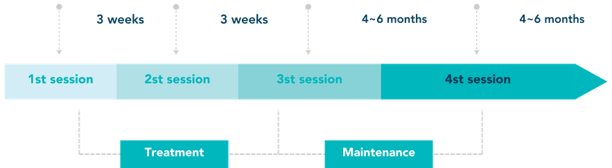 For optimal regenerative results, the most commonly recommended protocol is 3 sessions at 3-week intervals, however each patient’s personal treatment plan will be decided after consultation with the doctor, and may vary depending on the severity of your concerns and your treatment goal.